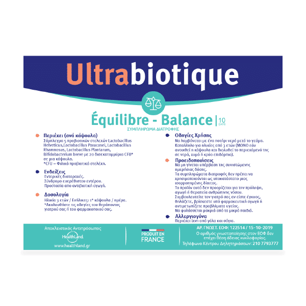 Το Ultrabiotique Balance, είναι ένα συμπλήρωμα διατροφής, που συμβάλλει στην ενίσχυση του ανοσοποιητικού, την καταπολέμηση παθογόνων μικροοργανισμών, την βελτίωση εντερικών διαταραχών λόγω φαρμακευτικής αγωγής και την βελτίωση προσωρινών και χρόνιων εντερικών διαταραχών.