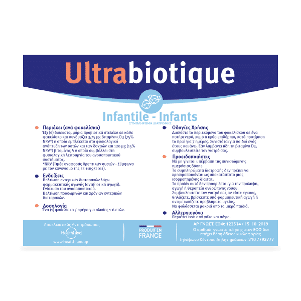 Το Ultrabiotique Infantile, είναι ένα συμβιωτικό* συμπλήρωμα διατροφής ειδικά σχεδιασμένο για παιδιά, που συμβάλλει στην ενίσχυση του ανοσοποιητικού (ιώσεις χειμώνα, ατοπικές δερματίτιδες), στην καταπολέμηση των παθογόνων μικροοργανισμών και στην βελτίωση εντερικών διαταραχών λόγω φαρμακευτικής αγωγής.